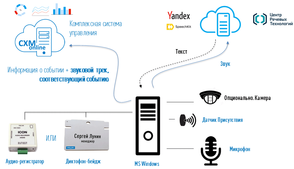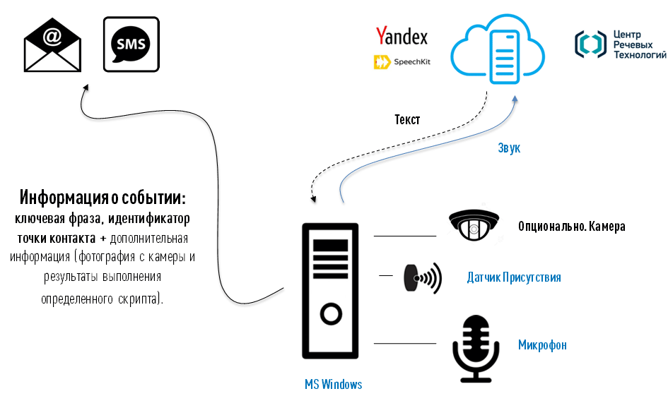 После произнесения в точке контакта ключевого слова или фразы, например "возмутительно", "дорого" и т.п., на определенные адреса электронной почты автоматически отправляется сообщение, включающее ключевую фразу, идентификатор точки контакта, где она прозвучала, фотографию с web/IP камеры, дополнительную информацию, получаемую в результате выполнения VB-скрипта (например, информация о составе чека).