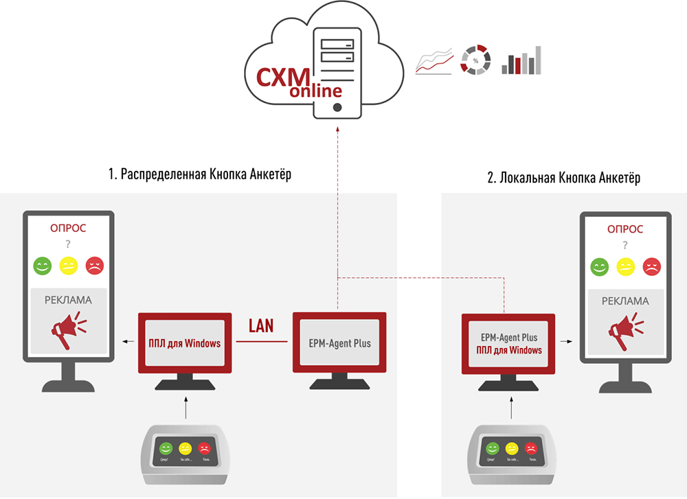 - Локальная Кнопка Анкетёр. В этом случае опросный (кнопочный) пульт подключается к компьютеру, к которому подключен опросный монитор и на котором выполняются оба приложения: EPM-Agent Plus и ППЛ для Windows.