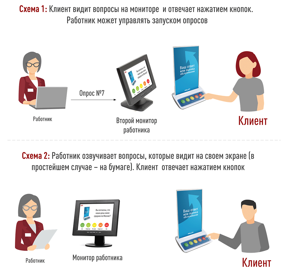 - Схема 1. Клиент видит вопросы на мониторе и отвечает нажатием кнопок на пульте Кнопки Лояльности (или голосом). В качестве монитора можно использовать Дисплей Покупателя – второй монитор, подключенный к кассе или компьютеру фронт персонала (далее – опросный монитор).