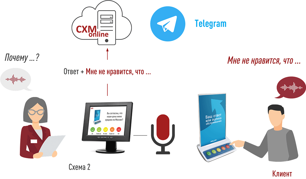 При использовании Схемы 2 работники могут задавать клиентам дополнительные вопросы. Например: «Что нужно сделать, чтобы ваша оценка повысилась?» или «Чем вызвана такая низкая оценка?» и т.п. Ответы на дополнительные вопросы клиента (или их повторное произнесение работником, «я правильно вас поняла, что …») могут автоматически записываться, транскрибироваться и с «привязкой» к ответу на основной вопрос автоматически передаваться в сервис CXM-Online и/или группу Telegram. Подробнее см. Органическая обратная связь (голосом), ответы голосом.