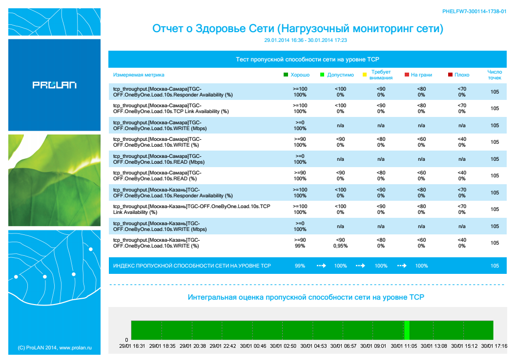 Здоровье сети характеризуется множеством метрик – утилизация, ошибки, джиттер, число потерянных пакетов и т.д. Значения этих метрик влияют на пропускную способность сети, поэтому выход любой из них за допустимый диапазон значений вызывает снижение пропускной способности сети. Таким образом, чтобы узнавать о проблемах до того, как они скажутся на работе пользователей, достаточно контролировать пропускную способность сети, что дешевле, проще и удобнее, чем контролировать множество «сырых» метрик.