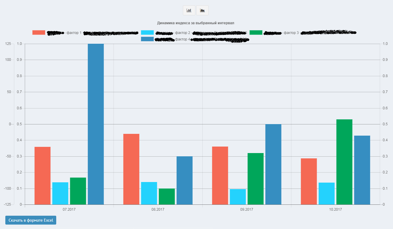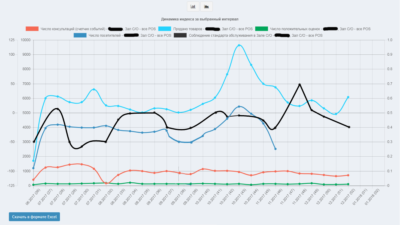 Поддерживается возможность "привязывать" к единой временной шкале, отображать в виде графиков и выгружать в форме временных рядов в MS Excel, с одной стороны, показатели Соблюдения Стандарта Обслуживания, характеризующие Процесс, с другой стороны, конверсию, число позиций в чеке и другие показатели, характеризующие полученный Результат.