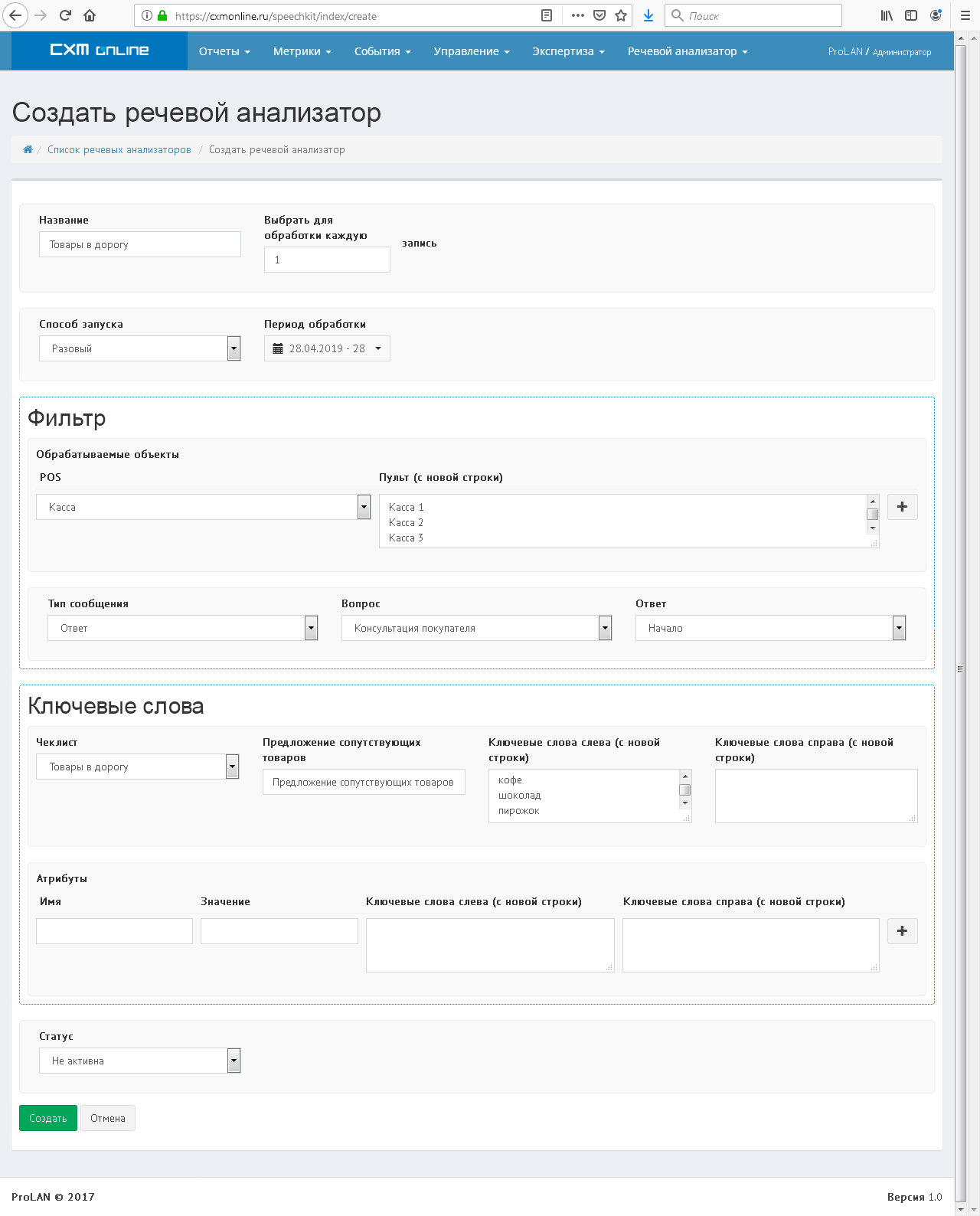 Для оценки работы фронт персонала по соответствующему скрипту, разговоры могут анализироваться с использованием систем речевой аналитики, в частности, сервиса Yandex SpeechKit. Для этого в сервисе CXM Online с использованием речевого анализатора создается набор экспертиз, каждая из которых может автоматически оценивать разговор на соответствие определенному правилу (присутствию в разговоре определенных слов). Результатом экспертизы является автоматическое заполнение соответствующего чек листа и/или присвоение записи определенного атрибута. Один разговор может обрабатываться несколькими экспертизами.
