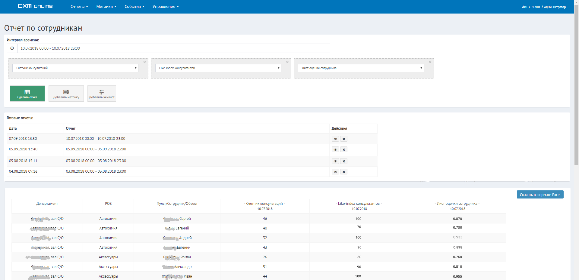 На основе получаемых данных могут создаваться консолидированные отчеты по эффективности фронт персонала. Такие отчеты, кроме соблюдения стандарта обслуживания могут включать и другие показатели, например, NPS, Like-Index (% Нравится - % Не нравится), число проведенных консультаций и т.п. Информация может выгружаться в MS Excel. Высокая репрезентативность и достоверность получаемой информации позволяет её использовать в системах мотивации без риска демотивировать персонал.