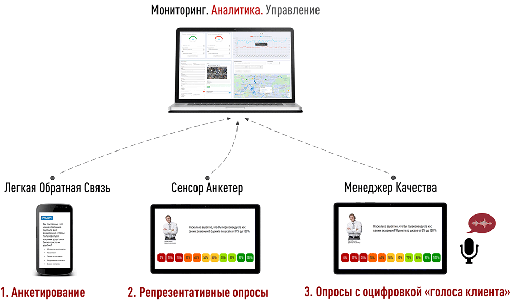 - Репрезентативные опросы Напрокат. Профессиональный инструментарий на основе продукта Терминал Обратной Связи и Сенсор Анкетер для проведения количественных маркетинговых исследований. Позволяет получать репрезентативные оценки по клиентским ожиданиям, предпочтениям и клиентскому опыту. При наличии адекватной Факторной Модели позволяет эффективно управлять качеством клиентского сервиса (в широком смысле).