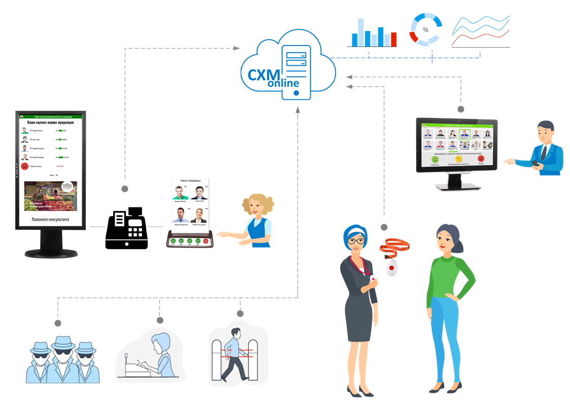 Вся получаемая информация (нажатия кнопок, оценки покупателей, фотографии и т.п.) автоматически передается в общую базу данных. Туда же могут передаваться данные о числе посетителей, числе продаж, результаты проверок Тайных покупателей и другая информация.