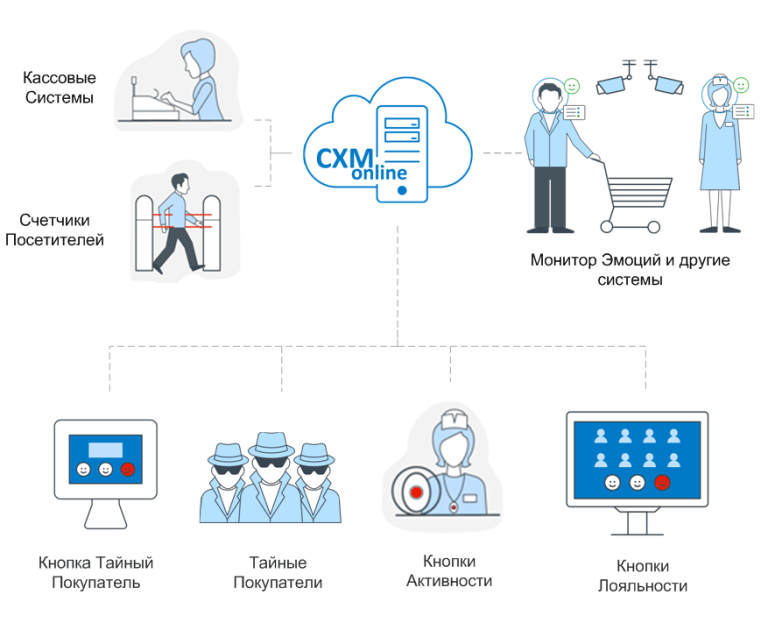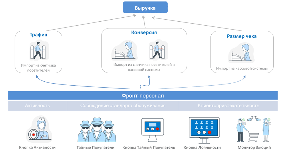 Источники информации: Тайные Покупатели, Кнопки Активности Продавцов, Кнопки Лояльности, Электронный Тайный Покупатель, Кассовые системы, Счетчики посетителей, Монитор Эмоций 2.0 и другие системы.