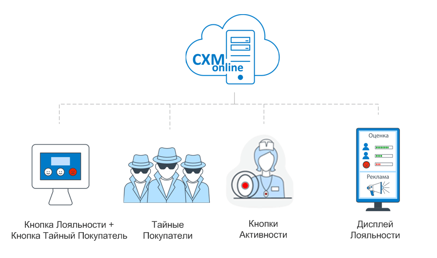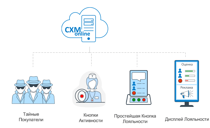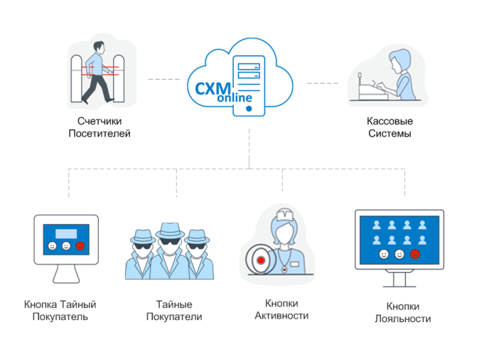 Источники информации: Тайные Покупатели, Кнопки Активности Продавцов, Кнопки Лояльности, Электронный Тайный Покупатель, Кассовые системы, Счетчики посетителей.
