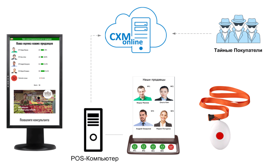 На кассе и/или на выходе из магазина (возможны варианты) устанавливается сенсорный монитор или кнопочный пульт с фотографиями продавцов и смайликами. Покупателю предлагается оценить качество работы продавца, который его обслуживал.