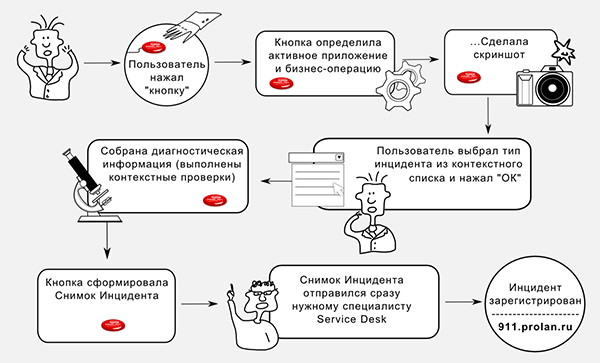 Пользователь нажимает «красную кнопку» при возникновении инцидента – события, не являющегося частью нормальной работы ИТ-сервиса, способного привести к полному прекращению функционирования сервиса или снижению уровня его качества (ITIL v.3).
