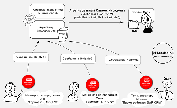 Пример. Предположим, количество жалоб топ-менеджеров из Москвы на работу SAP CRM, в обычные дни не превышающее 3-4, достигло 15 за полдня (при пороговом значении оценки метрики для отправки Агрегированного Инцидента, соответствующем 7 жалобам). Такой рост количества жалоб не может не указывать на серьёзные проблемы в работе самого ИТ-сервиса (SAP CRM) или поддерживающей его ИТ-инфраструктуры.
