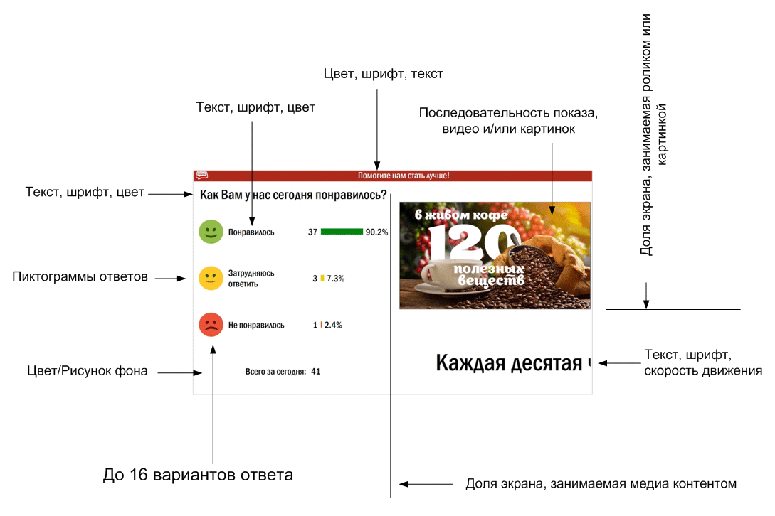 На Терминале клиентам задается вопрос типа: "Как Вам у нас сегодня понравилось?" и предлагаются конкретные варианты ответа, например, "Понравилось", "Так себе", "Плохо". Другие варианты ответа не принимаются.
