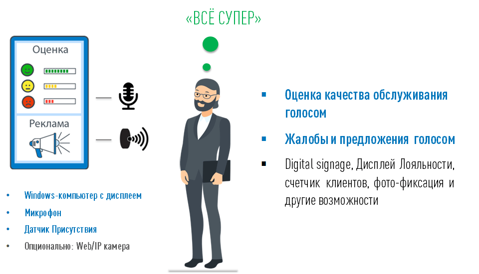 Терминал VoiceClik наиболее эффективен в точках рекламы товаров или услуг, когда важна информация об их восприятии клиентами
