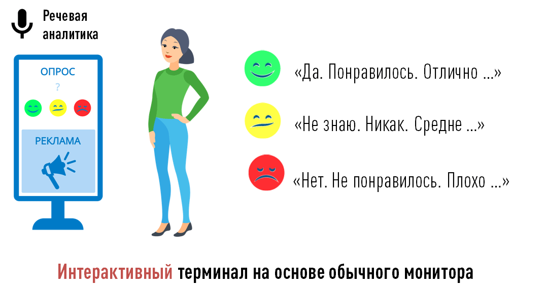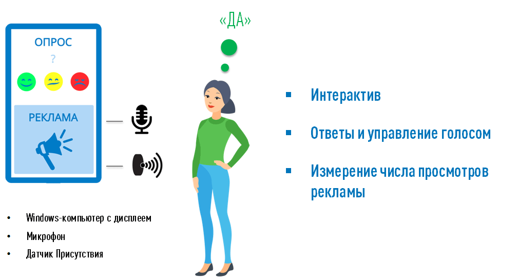 Терминал VoiceClik автоматически определяет нахождение клиента перед экраном (лица клиента), после чего автоматически выводит на экран определенный опрос (интерактив). При использовании сенсорного экрана клиенты могут отвечать на вопросы как голосом, так и касанием экрана. При использовании обычного экрана - только голосом. Если клиент в течение определенного времени не отвечает на какой-то вопрос, то опрос автоматически прекращается.