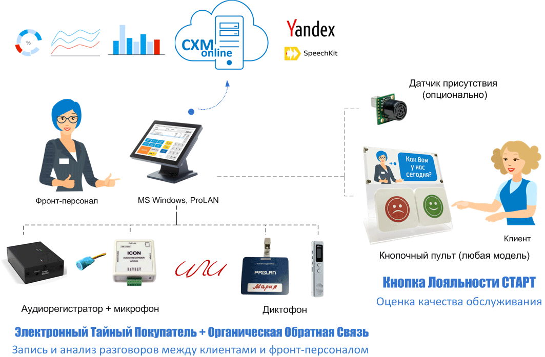 - Профессиональное решение ПРОК@КАССА, предназначенное для повышения конверсии, среднего чека, качества обслуживания и лояльности клиентов. Одной из задач является диагностика негативных отзывов. ПРОК@КАССА - это профессиональная модель Кнопка Лояльности на основе сервиса CXM-Online, интегрированная с системой записи и анализа разговоров между клиентами и фронт персоналом на основе аудиорегистраторов или диктофонов.