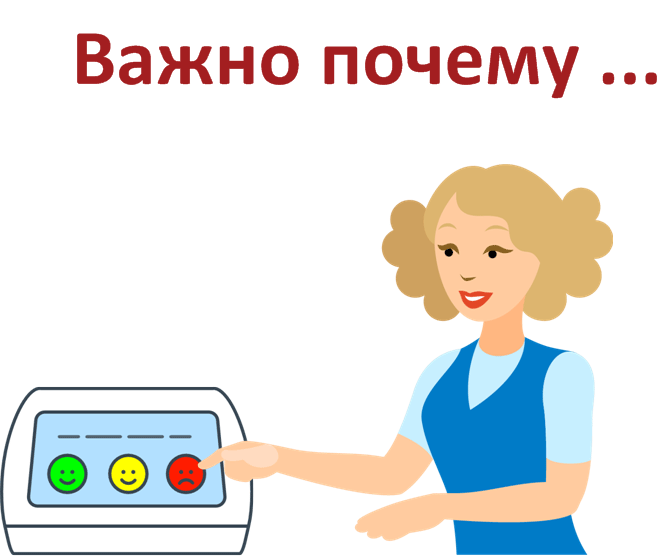 Фронт персонал должен видеть, какую кнопку нажимает клиент. Увидев, что клиент нажал кнопку «недоволен», он не должен отворачиваться или делать вид, что ему это безразлично. Клиентоориентированное поведение – принести извинения и задать уточняющий вопрос, с чем именно связано недовольство. Это решает несколько задач:
