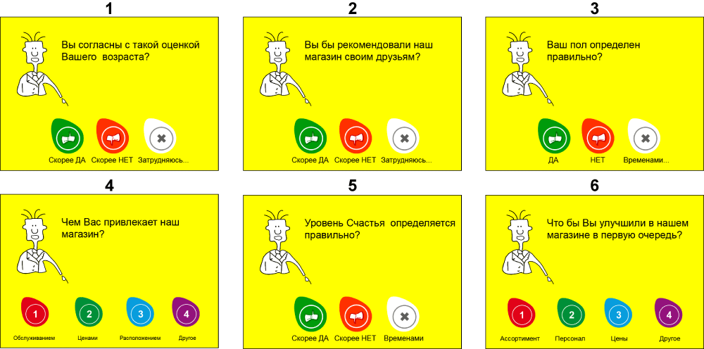 Пример экспресс опроса. Число вопросов (число экранов), их последовательность и графическое оформление можно настраивать. Единственное ограничение – на каждый вопрос может быть не более 10 вариантов ответа. Некоторые вопросы могут быть установочными.