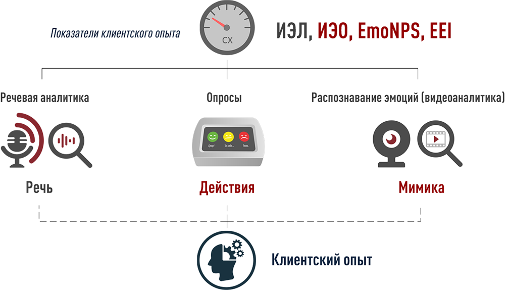 - Индекс Эмоционального Опыта (ИЭО), эмоциональный показатель, получаемый методом распознавания эмоций клиентов (видеоаналитики).