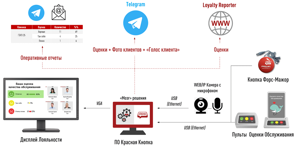 - Грубая оценка воспринимаемого качества услуг. Информации о нажатии кнопок в режиме реального времени передается в бесплатный облачный сервис Loyalty Reporter.