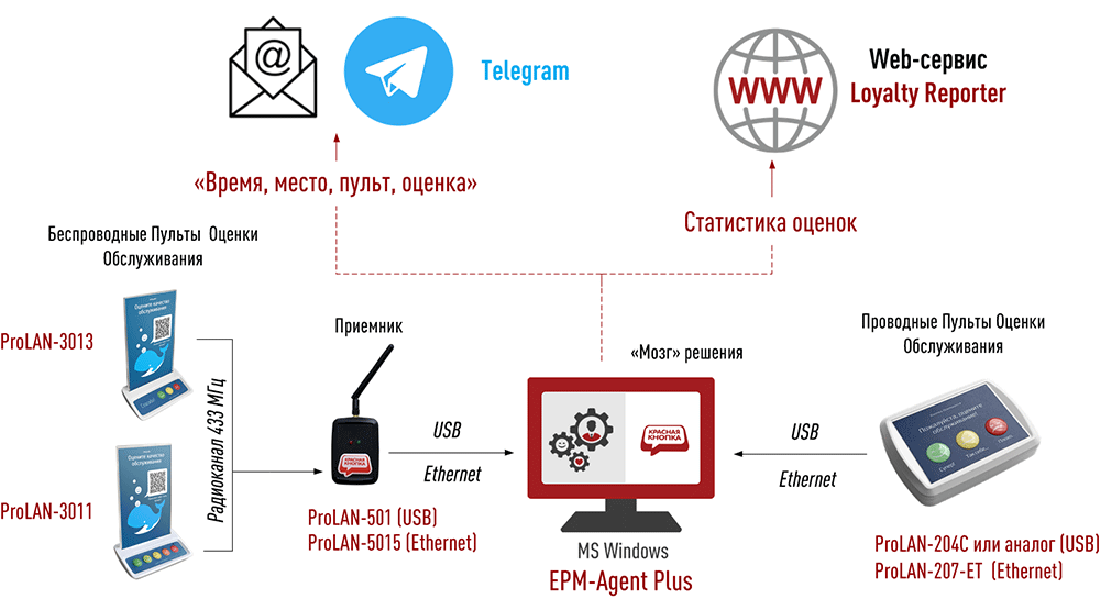 «Мозгом» решения является программа EPM-Agent Plus, работающая на Windows-компьютере. В качестве Пультов Оценки Обслуживания можно использовать: