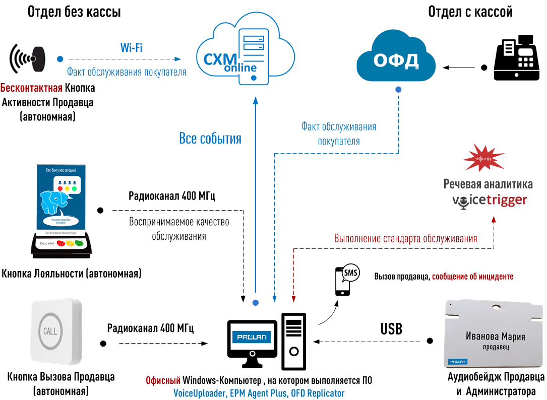 - В отделах без кассы - беспроводная бесконтактная Кнопка Активности Продавца, с помощью которой продавец, не снимая перчаток, фиксирует факт обслуживания каждого покупателя. Кнопка Активности может нажиматься до, в процессе или после завершения обслуживания покупателя. Каждое нажатие Кнопки Активности в режиме реального времени передается в облако CXM-Online, где фиксируется как событие, «привязанное» к определенному времени.