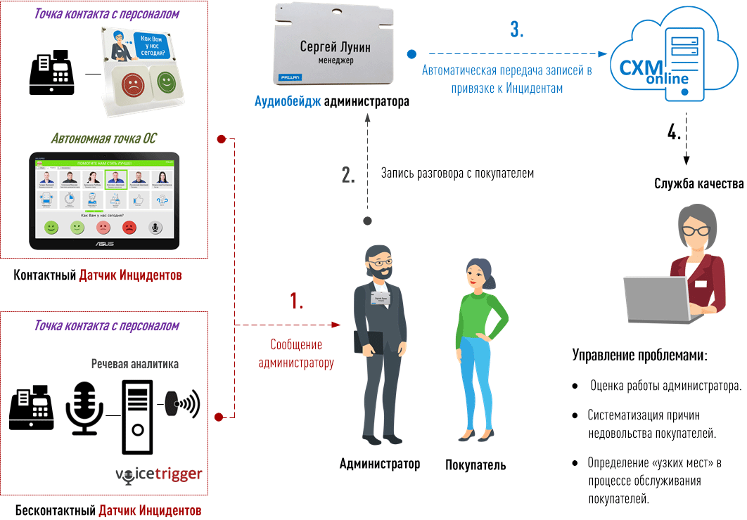 Получив сообщение об инциденте, администратор магазина должен подойти к недовольному покупателю и выполнить действия по урегулированию инцидента в соответствии со стандартом обслуживания. При этом администратор должен иметь с собой аудиобейдж, находящийся в режиме записи. В конце смены администратор подключает аудиобейдж к офисному компьютеру для зарядки встроенного аккумулятора. На компьютере выполняется приложение VoiceUploader, которое делает следующее: