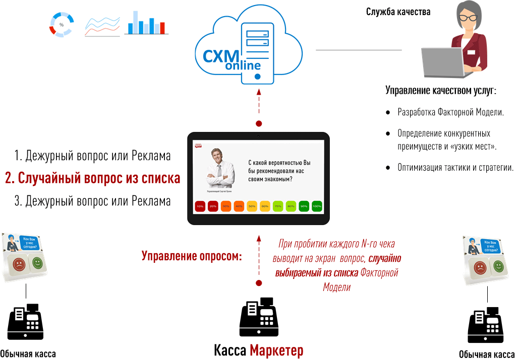 Ответы покупателей в режиме реального времени передаются в облако CXM-Online, где статистически обрабатываются и представляются в удобном для анализа виде. В результате служба качества и/или отдел маркетинга получают достоверную репрезентативную информацию по результатам опроса.