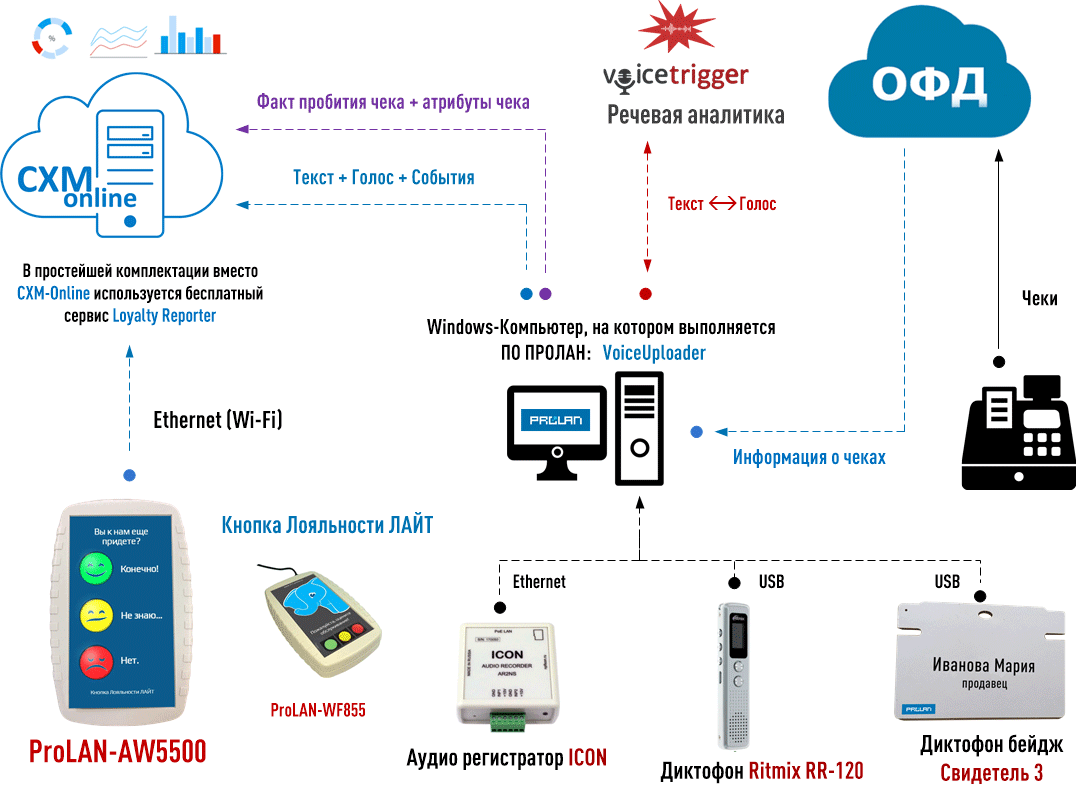 - Транскрибирует вырезанные треки с использованием речевой аналитики VoiceTrigger, определяет наличие в речи продавца определенных слов и выражений, формирует соответствующие метрики и события, которые передает в облако CXM-Online.