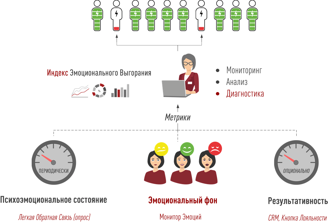 На основе получаемой информации рассчитывается Индекс Эмоционального Выгорания (ИЭВ), характеризующий эмоциональное выгорание фронт персонала.