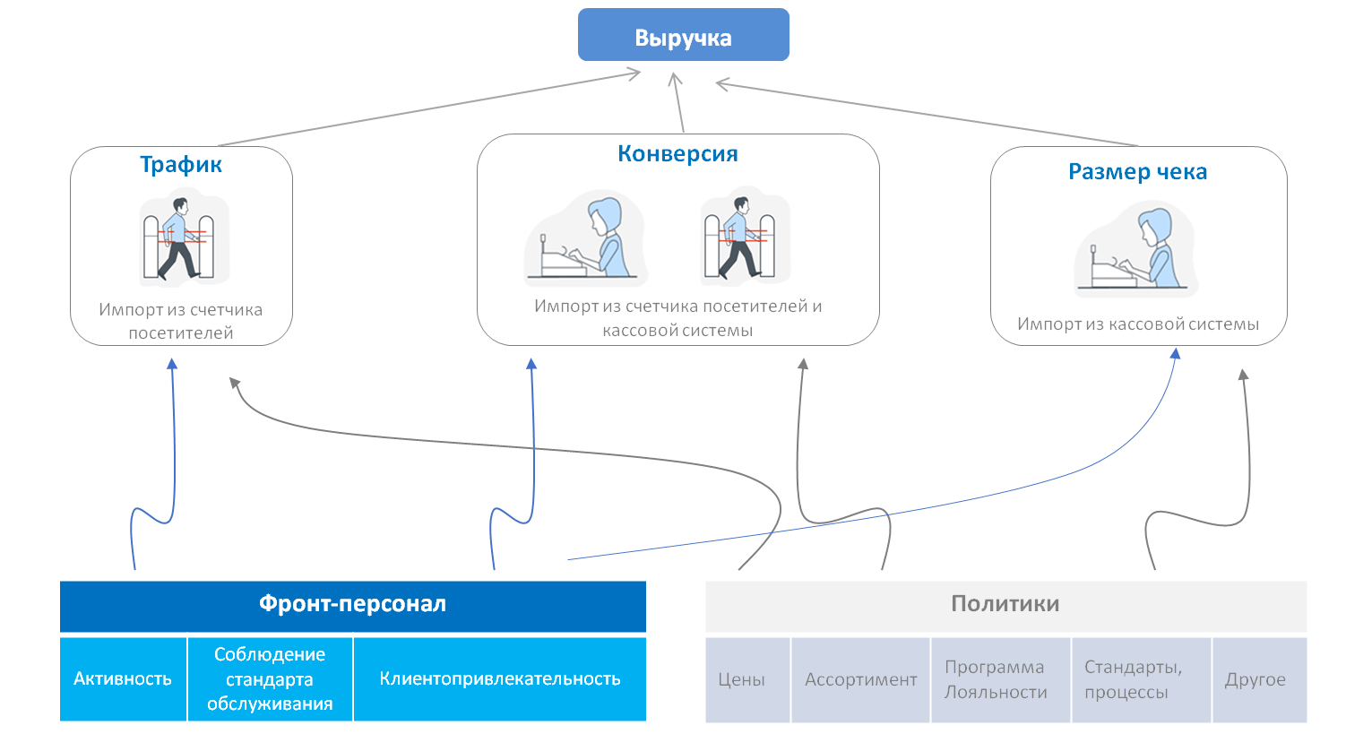 Первая часть решается экспортом с привязкой ко времени данных, получаемых с использованием: счетчиков посетителей, кассовых систем, кнопок лояльности, кнопок активности, результатов проверок методом Тайного Покупателя.