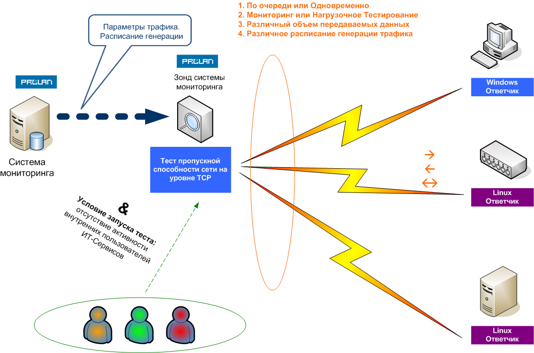 Отличие Нагрузочного Мониторинга Сети от тестирования сети с помощью Iperf, pathrate, chariot и других подобных средств в том, что Нагрузочный Мониторинг позволяет не только измерять пропускную способность сети, но и является важным элементом системы управления качеством предоставления ИТ-Услуг (Service Level Management). С технической точки зрения это означает следующее: