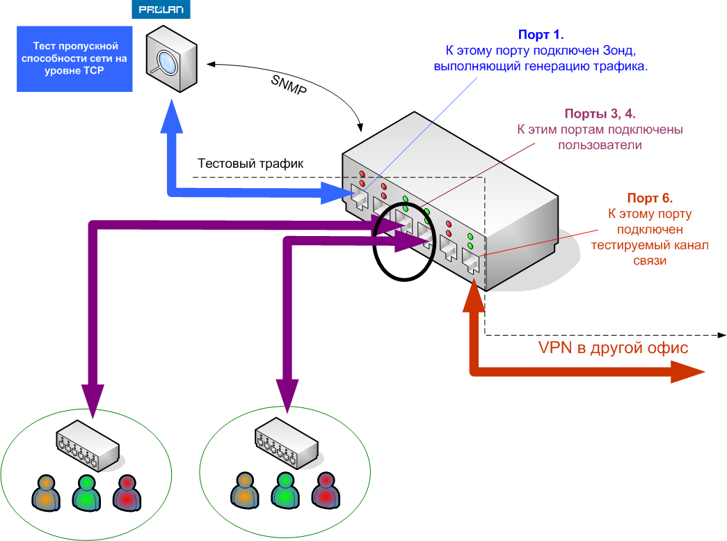 Предположим, тестируется канал связи, подключённый к 6-му порту маршрутизатора; см. Рисунок 2. При этом Зонд подключён к 1-му порту, а пользователи – к 3-му и 4-му портам. Предположим, Тест пропускной способности сети должен с 9-00 до 20-00 каждый час передавать 1 Мбайт данных от Ответчика к Зонду.