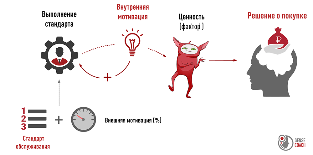 Внутренняя мотивация выполняет еще одну важную функцию — становится эффективным драйвером выполнения стандарта обслуживания. В отличие от внешней мотивации, которая работает лишь при наличии значимого стимула, внутренняя мотивация автономна и действует постоянно. Единственное условие - эффективность самого стандарта: его выполнение должно значимо коррелировать с вероятностью допродажи.