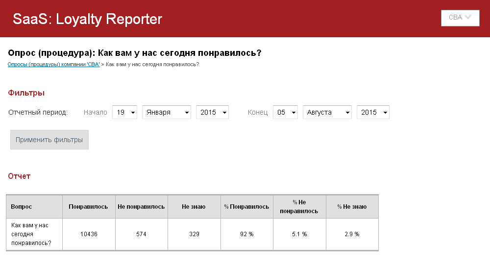 Пример одного из базовых отчетов, создаваемых в личном кабинете облачного сервиса Loyalty Reporter: