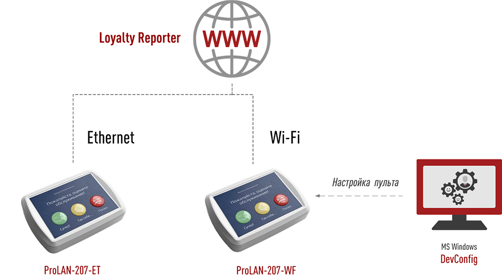 Пульт ProLAN-207 может быть «прошит» на передачу данных не в облачные сервисы (Loyalty Reporter, CXM-Online), а на компьютер локальной сети, работающий под управлением MS Windows, на котором выполняется программа EPM Agent Plus. Это расширяет возможности решения, «превращая» Кнопку Лояльности ЛАЙТ в Кнопку Лояльности СТАРТ. Стоимость пульта ProLAN-207 от «прошивки» не зависит.