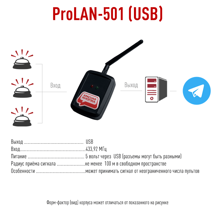 ОПЦИОНАЛЬНО. Беспроводной модуль ввода данных ProLAN-501, ProLAN-5015, ProLAN-505. ProLAN-501 подключается к компьютеру по USB, ProLAN-505 – по RS232, ProLAN-5015 – по Ethernet. Используется для подключения беспроводной кнопки ProLAN-150. |