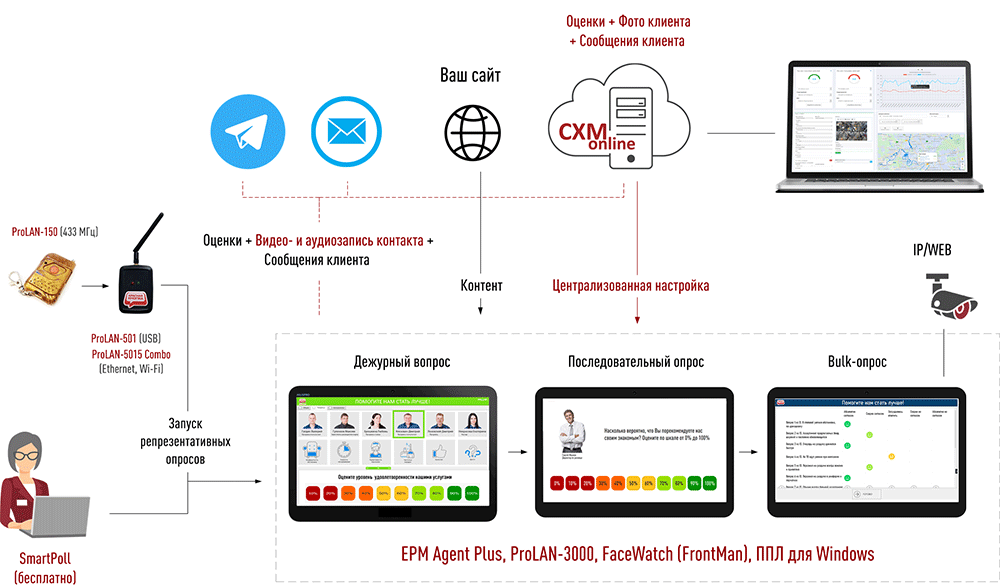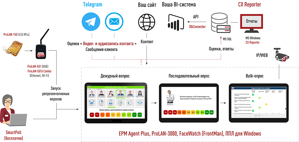 - Режим 2: Управляемый опрос по инициативе персонала. Позволяет получать репрезентативные показатели клиентского опыта.