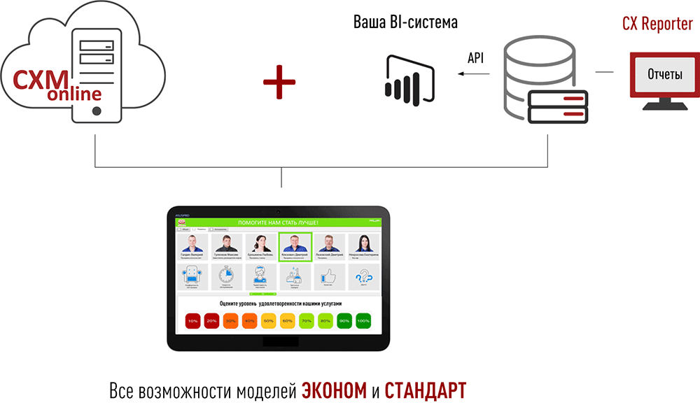 - Комплектация №1: ЭКОНОМ. Базовая комплектация, позволяющая «услышать» клиентов с помощью обратной связи (стихийных опросов) и получать достоверные и репрезентативные оценки клиентского опыта с использованием управляемых опросов. Для создания отчетов и аналитики используется клиент-серверное приложение СX Reporter на базе MS SQL Сервера. Обеспечивается возможность интеграции с внешними BI-системами. На все ПО предоставляется бессрочная лицензия.
