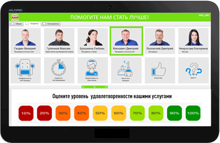 Клиент, желающий оставить обратную связь (принять участие в стихийном опросе), в произвольный момент времени подходит к ОПК, кликает на фото работника или пиктограмму услуги, и в появившемся на экране опросе имеет возможность: