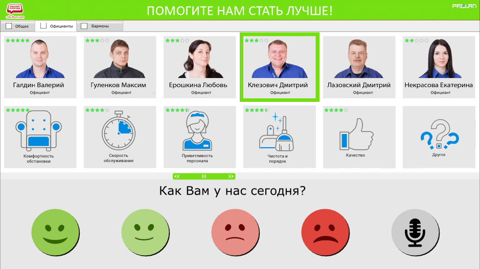 Клиент подходит к ОПК, кликает на фото работника, который его обслуживал (или пиктограмму компании или услуги), и отвечает на вопросы управляемого опроса. Если клиент в течение определенного времени не начинает отвечать на вопросы, коммуникация по данному работнику закрывается и ОПК переходит в Режим 1.