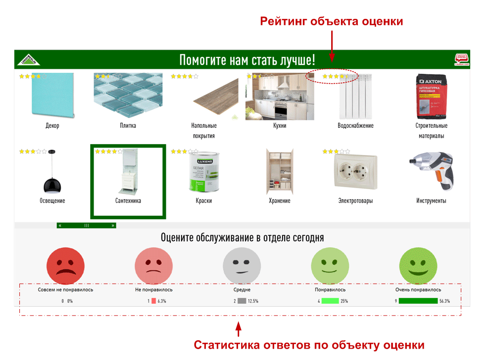 - Возможность размещать на экране терминала и группировать по закладкам до 256 пиктограмм и фотографий, кликнув на которые клиенты могу оставить обратную связь или ответить на вопросы управляемого опроса.