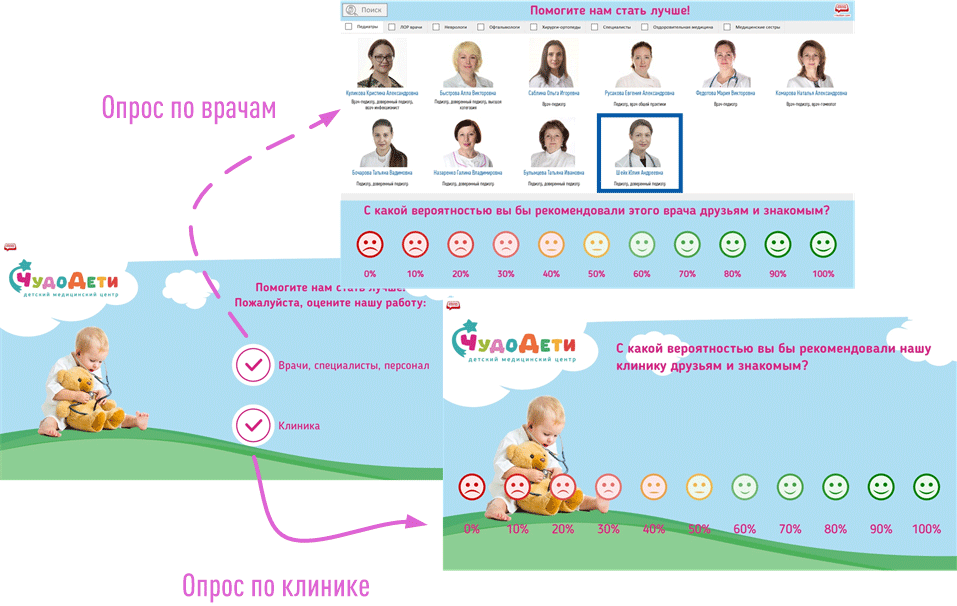 - Интеграция с приложением передней линии (например, компьютером врача) и BI-системой. Интеграция с приложением передней линии обеспечивает возможность проведения репрезентативных опросов без участия интервьюера и «привязку» оценок качества обслуживания к виду услуг и т.п. Интеграция с BI-системой позволяет использовать получаемые данные для тактического и стратегического управления эффективностью бизнеса и повышает ROI.