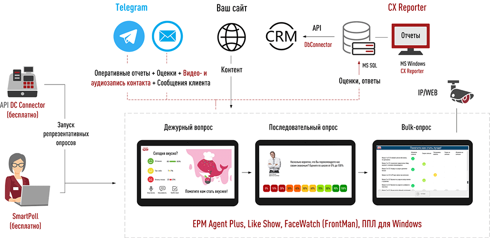 Сенсорный Фронт Мотиватор может интегрироваться с приложением передней линии (например, кассовой системой) и с CRM. Для интеграции с приложением передней линии используется API: DC Connector. Для интеграции с СRM - API: DbConnector.