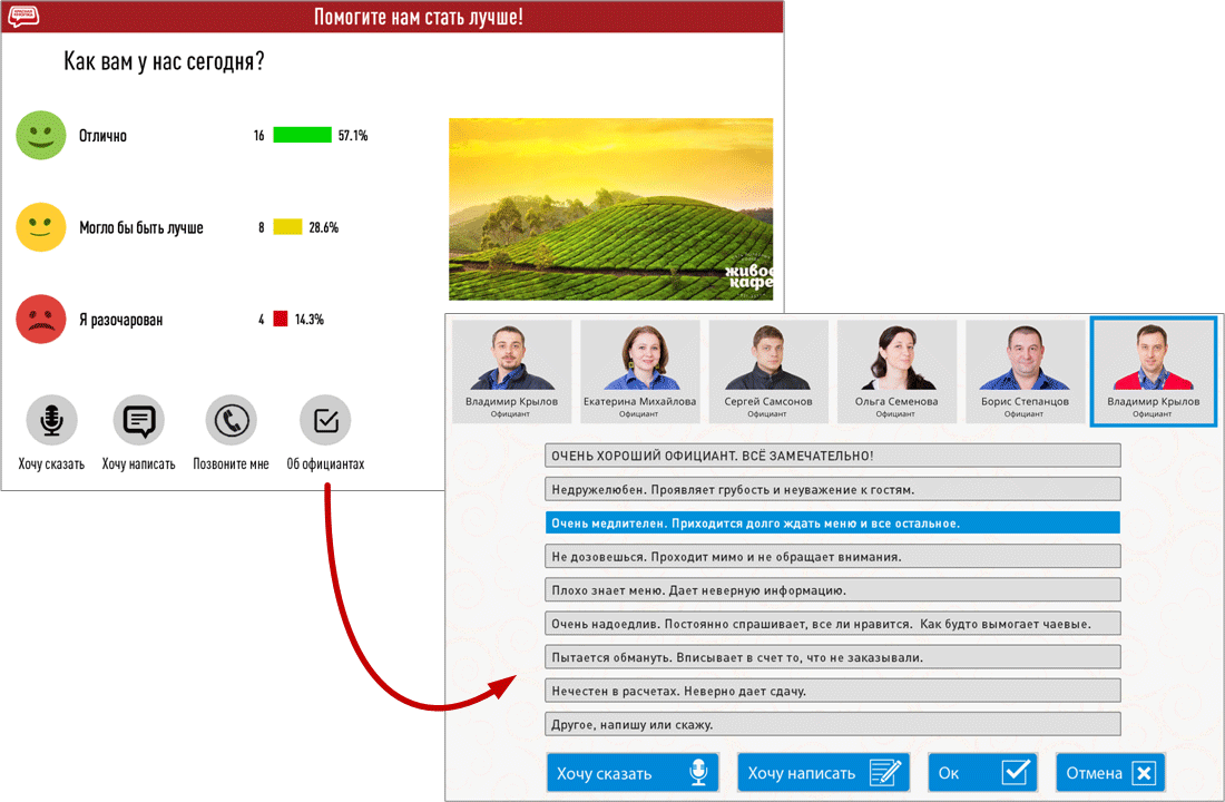 Уникальным преимуществом продукта является возможность использования в качестве аппаратной платформы POS терминала со вторым сенсорным монитором. Подробнее см. Планшет или сенсорный монитор, подключенный к компьютеру. Что выбрать для управления качеством обслуживания?