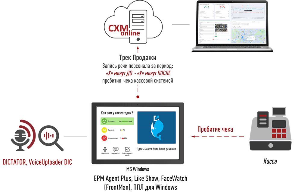 Сенсорный Фронт Мотиватор в комплектации ПРЕМИУМ включает программы DICTATOR и VoiceUploader DIC, поддерживающие решение Электронный Тайный Покупатель.