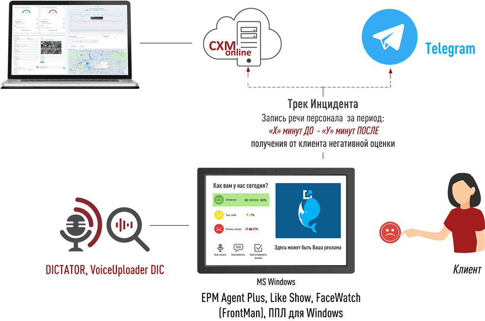 Программа Voice Controller позволяет автоматически фиксировать в точках контакта определенные голосовые события, например, конфликтные ситуации и возражения клиентов ("возмутительно", "пригласите менеджера", "дорого" и т.п.) и автоматически отправлять их в сервис CXM-Online и т.п. и/или группу Telegram. Подробнее см. Бесконтактный Датчик Инцидентов.