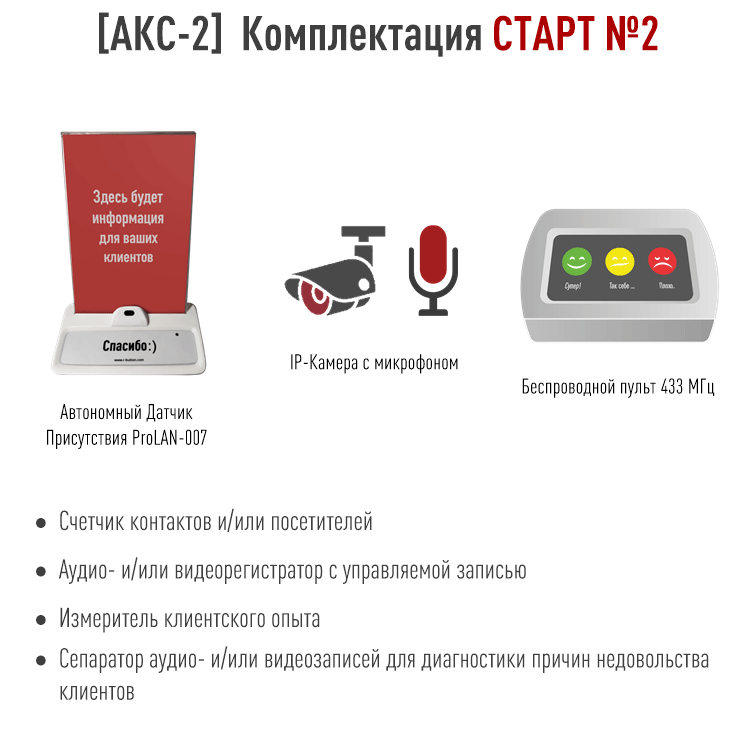 - Постоянный мониторинг клиентского опыта + диагностика по требованию. В этом случае на постоянной основе в каждой точке контакта устанавливается Кнопка Лояльности СТАРТ 433 МГц, которая на время диагностики дополняется АК 2.0 в комплектации СТАРТ №1;