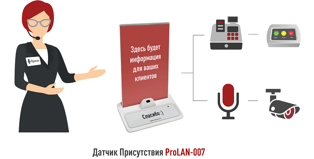 Ключевым элементом Анализатора Контактов 2.0 является Автономный Датчик Присутствия ProLAN-007, автоматически фиксирующий моменты прихода и ухода клиентов, а также измеряющий время нахождения клиентов в определенной точке (кассовая зона, стойка регистратуры и т.п. - точка контакта).