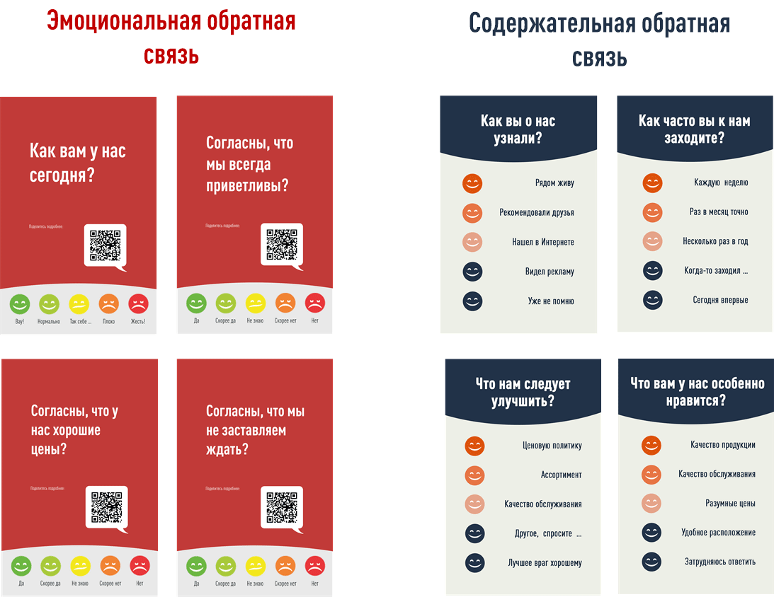Для получения Содержательной обратной связи используются пульты с одинаковыми смайликами, различающимися только цветом. В этом случае для обеспечения репрезентативности выборки фронт персонал должен вовлекать клиентов в опрос. При этом выбор клиентов должен быть случайным (рандомным). Это критически важно. Такой процесс получения информации называется Управляемым опросом. С помощью Управляемого опроса можно измерять NPS, CSI, CSAT и другие классические показатели.