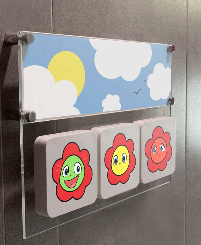 В детском учреждении устанавливается один или несколько беспроводных кнопочных пультов с большими (85*85 мм) красочными кнопками-эмоциями. Крепление кнопок к пульту позволяет их легко менять. Пульты могут иметь разное количество кнопок: 3, 4, 6, 8. Картинки эмоций могут рисоваться под заказ в соответствии с требованиями детского учреждения.